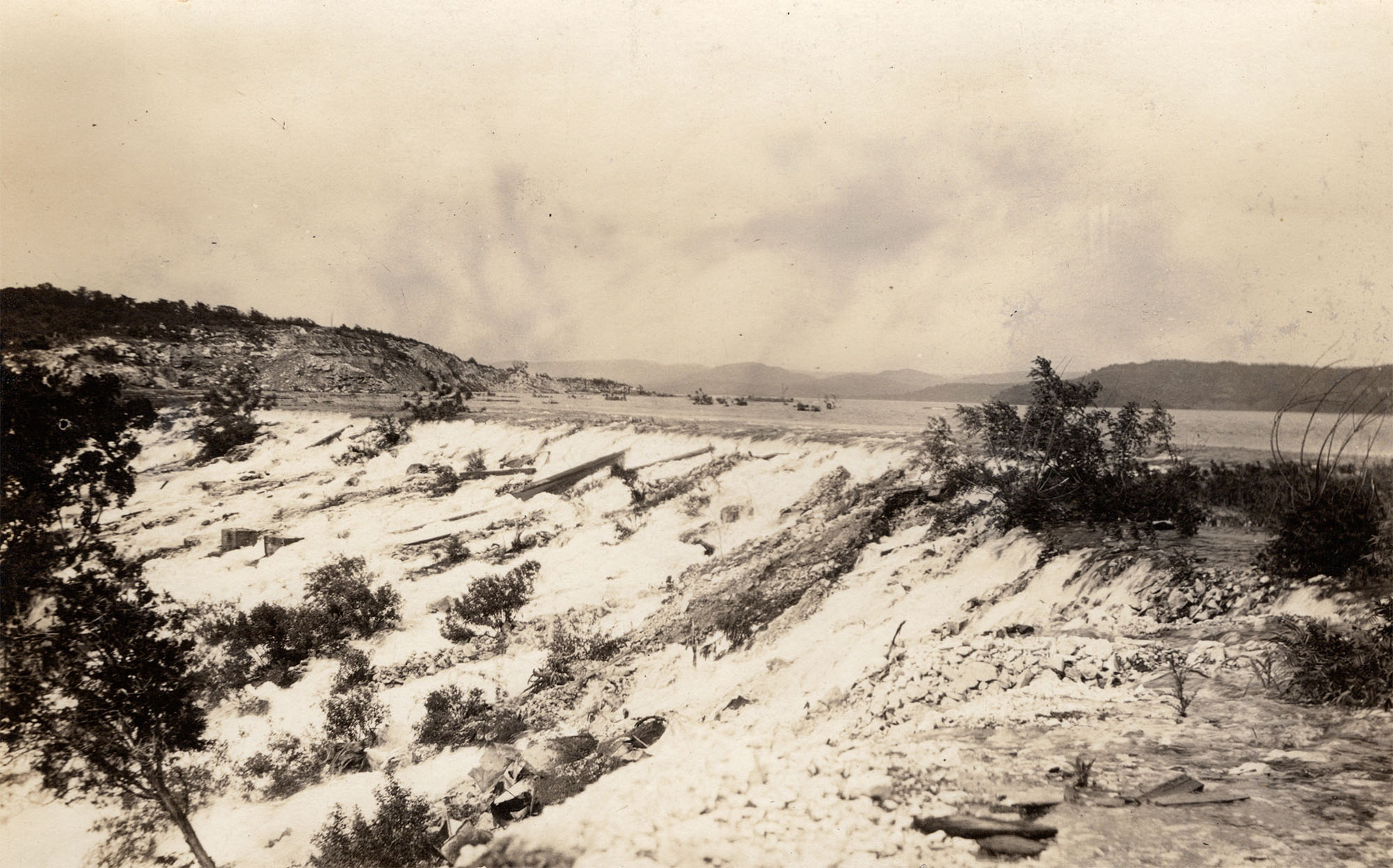 The pace of construction was frenetic, mostly because the builders expected large floods in the summer of 1913 that would fill the reservoir. The floods never materialized, and after construction was complete in November 1912, it was 18 months before any significant rains occurred. The Lake was not filled to capacity for the first time until September 1919. Wildly fluctuating levels have characterized Medina Lake throughout its entire history, because the Medina River watershed is simply not large enough, and rainfall is not reliable enough, to keep the Lake consistently filled. The designers were likely aware of this. In addition to capturing water from the Medina watershed, in 1911 they had also applied for a diversion of water from the upper Guadalupe River watershed. It would have involved a nine mile flume or tunnel to deliver Guadalupe River water to Mason Creek, and thence into Medina Lake. In 1914 the Board of the Medina Irrigation Company voted to abandon their application for water from the Guadalupe. Even these plans, if they had been completed, might not have ensured that water would always be in Medina Lake, because when the Medina River watershed is dry, flows in the upper Guadalupe can also be very small. Medina Dam was only one component of Alex Walton's comprehensive master plan to establish town sites and sell land to prospective farmers. His group established the Medina Irrigation Company and laid out the town of Natalia, named after Pearson's daughter Natalie. But before land sales could be started, world events spelled financial disaster for the project. When England became involved in World War I in 1914, Pearson's access to British capital was limited, and the Company was placed in receivership. In order to make a personal appeal to British investors for more capital, Pearson and his wife boarded the Lusitania and perished when the ocean liner was torpedoed and sunk by a German submarine on May 7, 1915. After that, U.S. federal courts did not allow any land sales, so the Company leased land until it was released from receivership. The stockholders preferred selling the Company to reorganizing, and there were several failed attempts to keep the endeavor alive, but all the subsequent corporations also went into receivership. Finally, in 1950, assets that had cost $6 million to build were sold for $10 and "other valuable considerations" to the Bexar-Medina-Atascosa Counties Water Improvement District No. 1 (BMA), which voters had established in 1925 to oversee the project. The BMA has continued to own and manage the project ever since.